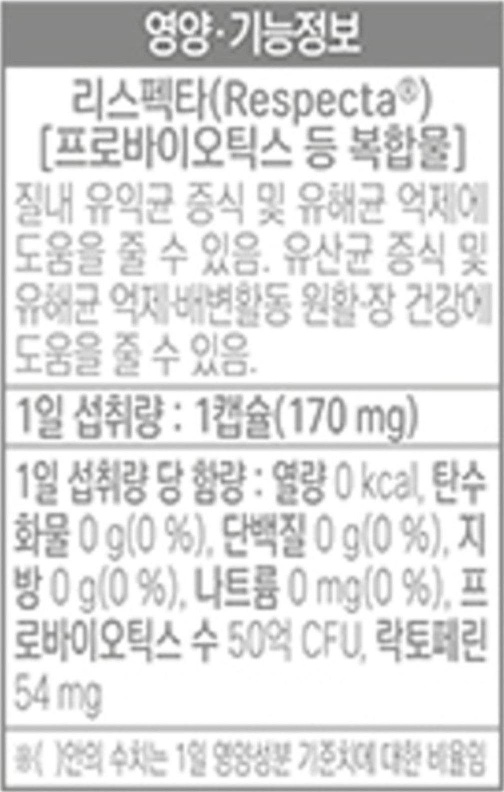 Respecta® Probiotics Complex [Lactobacillus acidophilus, Lactobacillus rhamnosus, lactoferrin concentrate], lactose mix (lactose, dextrin), crystalline cellulose, corn starch, silicon dioxide, magnesium stearate.